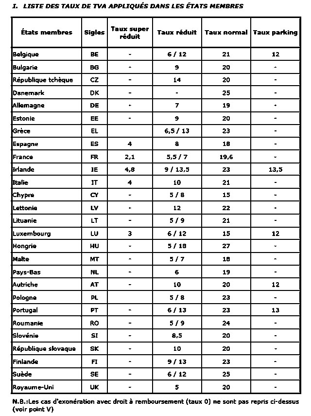 Vu sur le site de la commission européenne, le tableau de tous les taux de TVA dans les 27 états membres.