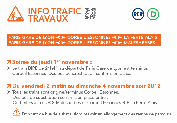 RFF arrête tous les trains de SNCF entre Corbeil et La ferté Alais pendant les 4 jours de la Toussaint.