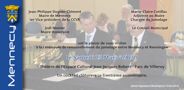 Samedi prochain, cérémonie du renouvellement du jumelage entre Mennecy et Rennongen. L’année dernière, cette cérémonie a été organisée à Renningen, et nous allons avoir, cette année, son équivalent à Mennecy.