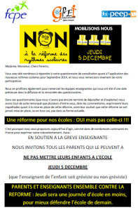 Alors que la grève du 5 décembre se met en place, nous attendons la notification des intentions de grève par les services académiques mardi matin (donc trop tard au sens de la loi), nous voyons les parents d’élèves des 3 associations présentes à Mennecy (FCPE, PEEP et une association indépendante, le GPEI) s’associer pour soutenir le mouvement des enseignants.