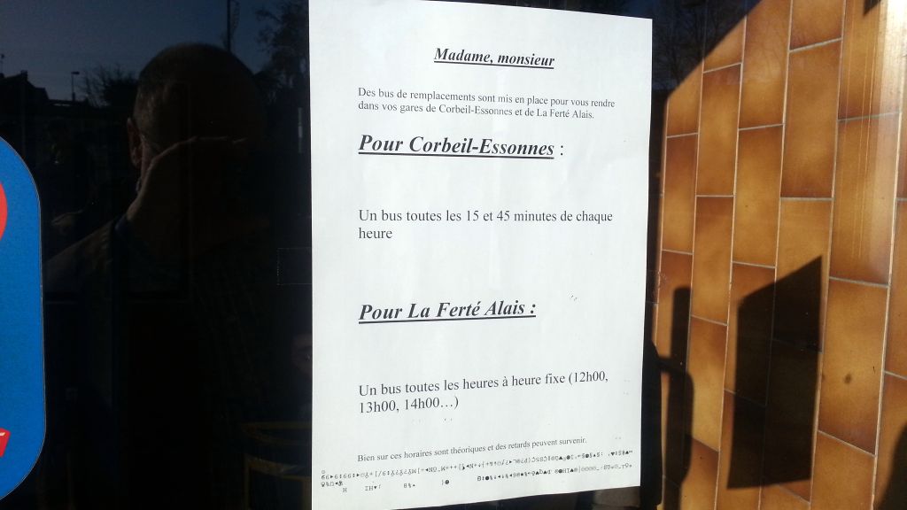En gare de Mennecy, les bus de substitution passent à une fréquence de 2 par heure dans chaque sens. Les panneaux lumineux sur le quai annoncent la suppression des trains et le remplacement par des bus, les horaires des bus sont affichés sur les 2 portes de la gare. Voir ci-contre.