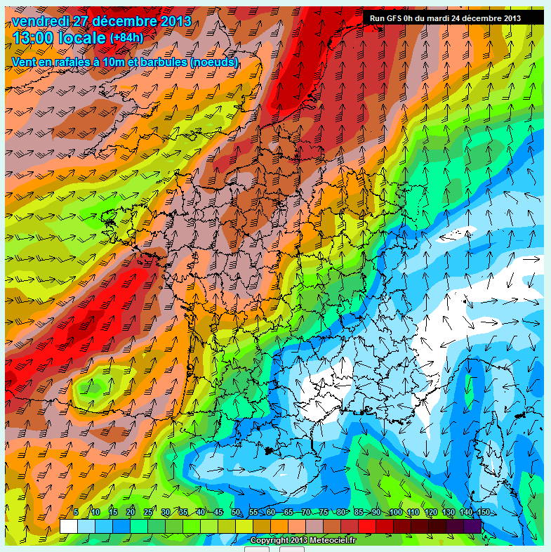 Ci-dessous, la prévision élaborée par le modèle GFS madi 24 à 0h00 pour vendredi 27 à 13h00.