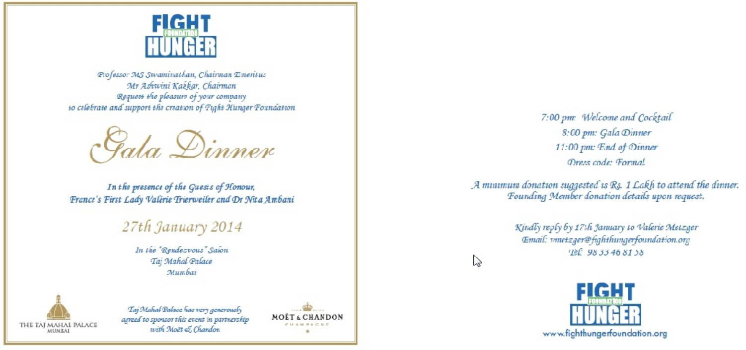 La fondation Fight Hunger Fundation organise un dîner de gala lundi soir, le 27 janvier 2014, à l’hôtel Taj Mahal de Bombay pour honorer et rassembler les fondateurs et les donateurs de cette fondation.