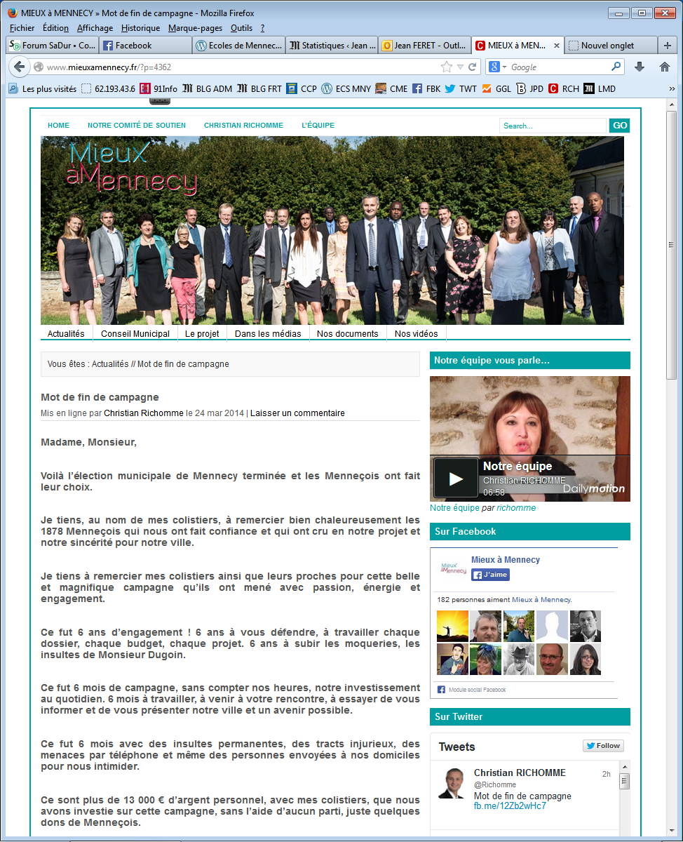 A noter aussi le mot de la fin pour la liste Mieux à Mennecy. Cette liste a choisi de snober la proclamation des résultats hier soir et crie à l’injustice aujourd’hui, dans un texte publié sur son site de campagne où il est question, un peu, de reconnaissance à des électeurs, mais pas tous, et, beaucoup, d’injustice, de détournements, de favoritisme, etc… Je vous en fait profiter ci-dessous, mais avec une version expurgée de toutes les fautes de français tant c’est une souffrance de lire tant de fautes, sans même parler de la qualité de l’expression et encore moins de la substance du message délivré. Mais c’est homogène à la performance en orthographe et en grammaire.