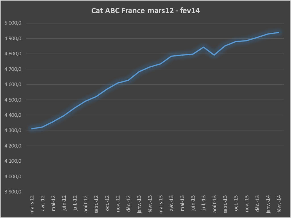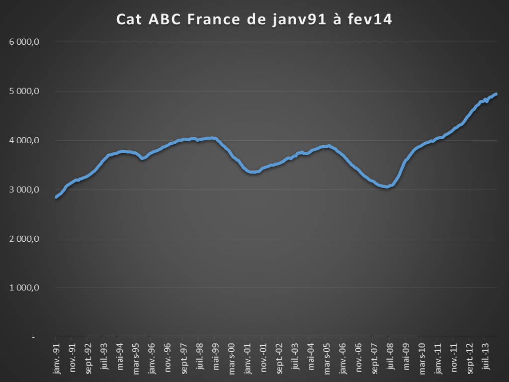 Hier, le ministère du travail a publié les statistiques mensuelles du chômage. Inutile d’ajouter des mots à tous les discours que vous avez déjà entendu. Je vous affiche 2 images tirées du tableau Excel publié par la DARES. La série mensuelle du total des catégories A, B et C pour toute la France, d’abord sur toute la série, de janvier 1991 à février 2014, puis de mars 2012 à février 2014.