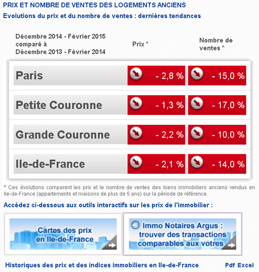 Sur le dernier trimestre, et en comparant à la même période un an plus tôt, les prix baissent de 2,2% et le nombre de ventes baisse de 10% dans la grande couronne.