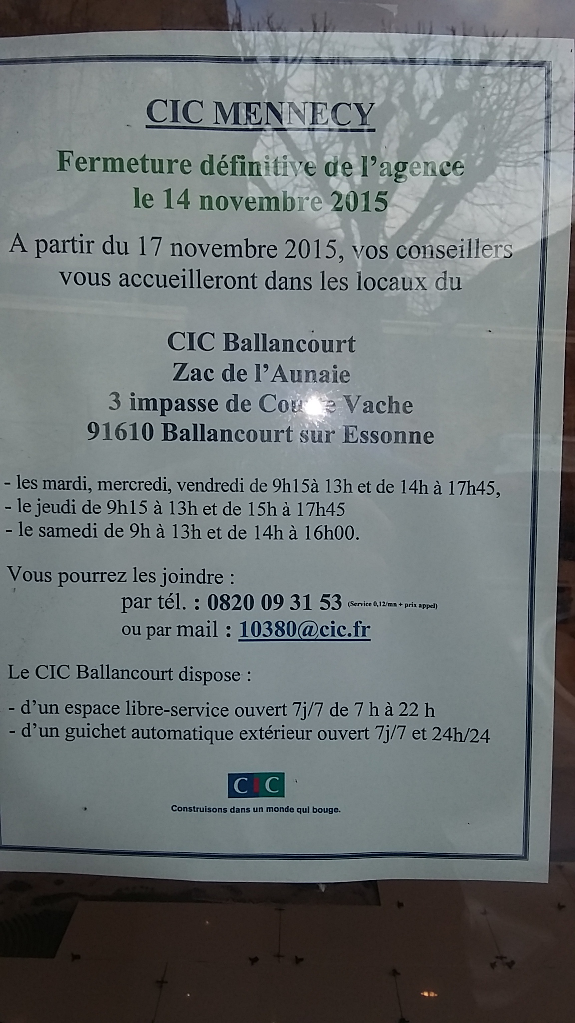 Les clients sont invités à se rendre à l’agence du CIC la plus proche, à savoir celle de Ballancourt, qui est à l’entrée du parking de la zone commerciale où se trouve Carrefour et le magasin de surgelés.