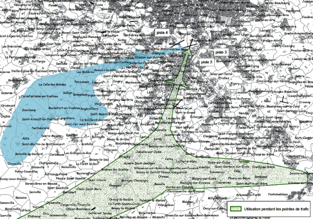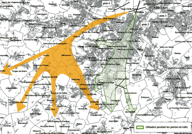 Ainsi, pour les atterrissages et en heure de pointe, par vent d’est à nord. l’utilisation de la piste 2, celle dont le seuil est aux abords du magasin Carrefour d’Athis Mons et de la N7. Les trajectoires sont plus souvent proches de Mennecy qu’en temps normal