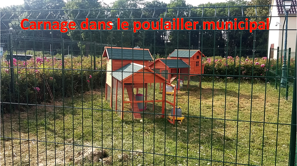 Lundi matin, 25 juillet 2016, stupeur à la mairie Monique Saillet: des 7 pensionnaires du poulailler municipal situé devant la mairie Monique Saillet, une seule était encore vivante, 5 gisaient mortes et le coq avait disparu.