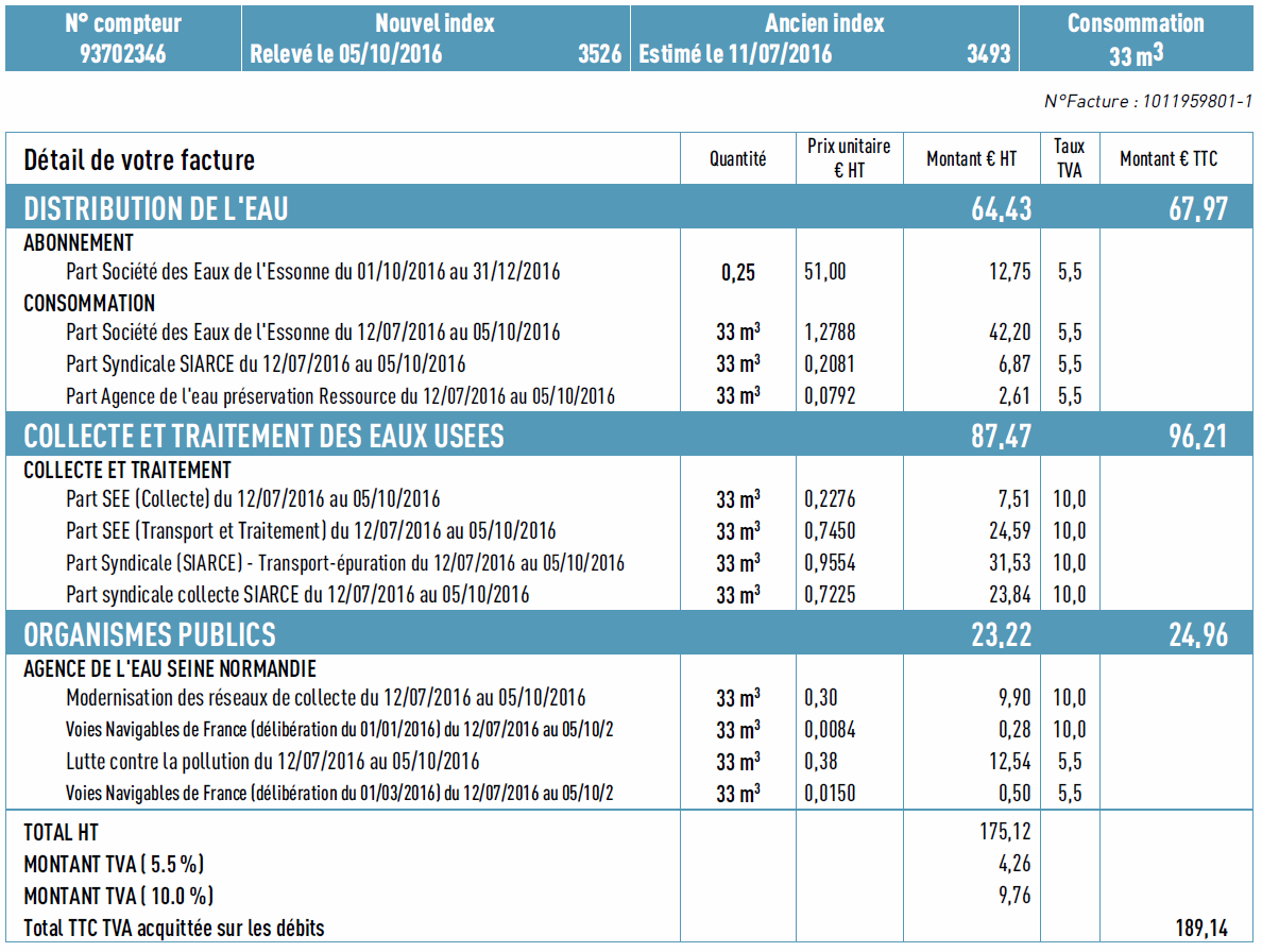 Ma mensualité passe ainsi de 47 à 66€, pour une consommation passant de 110 à 122m3. Cela indiquerait un prix du m3 qui passe de 5,12 à 6,49€TTC, mais c’est biaisé et il ne faut pas retenir ces chiffres.