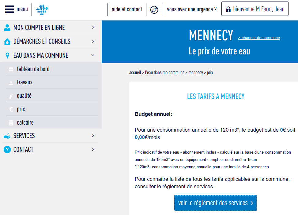 On pourrait aussi consulter le site de la société des eaux de l’Essonne, qui propose une page consacrée au prix de l’eau à Mennecy, mais on y trouve que l’eau est facturée… 0€. A ne pas retenir aussi, malheureusement.