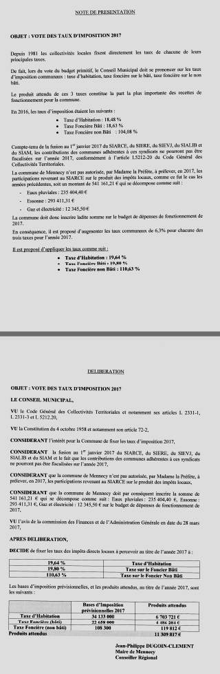 Nous avons la clôture de l’exercice 2016 et le budget 2017 à l’ordre du jour. Et parmi ces points budgétaires, il y a une délibération qui impacte tous les habitants de Mennecy (enfin, normalement tous…): les taux d’imposition de la taxe d’habitation (pour tous les habitants), de la taxe sur le foncier bâti (pour tous les propriétaires) et de la taxe sur le foncier non bâti (pour les propriétaires de terrains constructibles mais inoccupés).