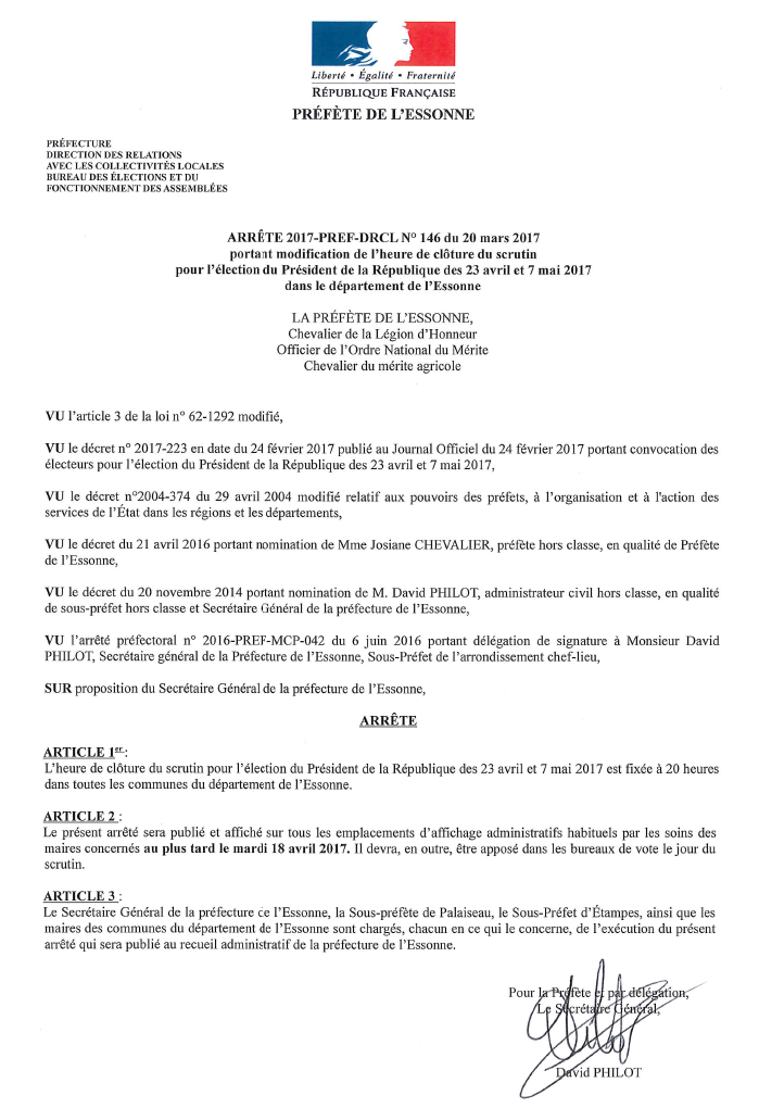 C’est le cas en Essonne où le préfet a pris un arrêté le 20 mars 2017 pour fixer l’heure de fermeture de TOUS les bureaux de vote du département de l’Essonne à 20h00