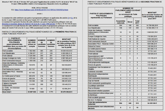 Les montants en euros répartis pour l’année 2017 sont ci-dessous. Cliquez sur l’image pour charger le PDF. Ils sont extraits du décret 2017-251 du 27 février 2017