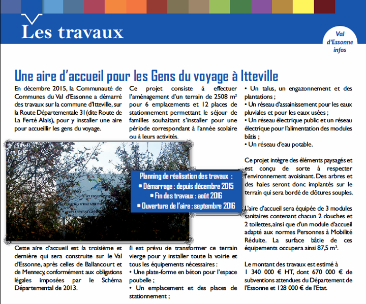 Une subvention importante est encore attendue de la part du département de l’Essonne. Rappelons qu’il existe déjà une aire à Ballancourt (6 emplacements pour 12 places, ouverte fin 2010) et une autre à Mennecy (10 emplacements (20 places, ouverte en 2012) Mais que ce soit la CCVE ou le département, c’est toujours l’argent du contribuable qui sert à l’investissement.