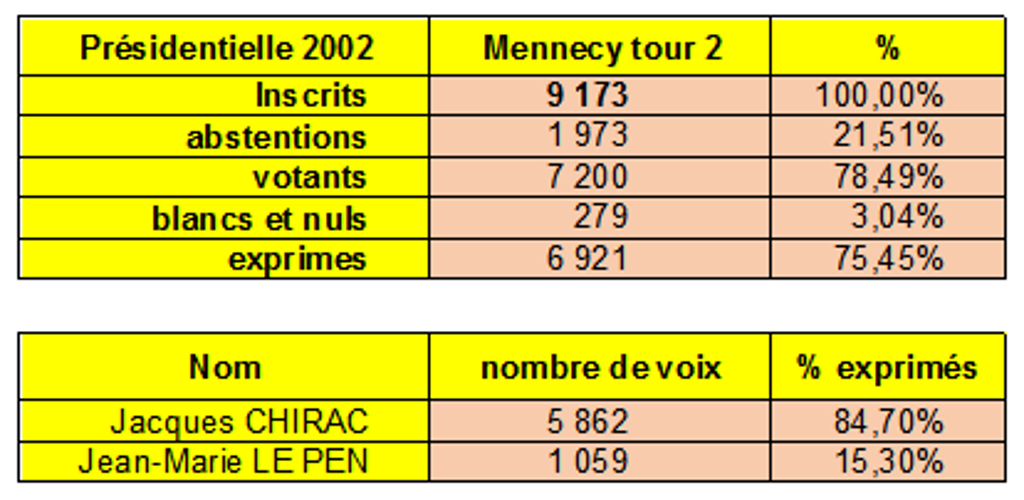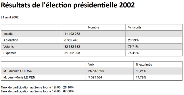 Pour rappel, en 2002 au 2nd tour, qui opposait Jacques Chirac à Jean-Marie Lepen, les résultats avaient été,
