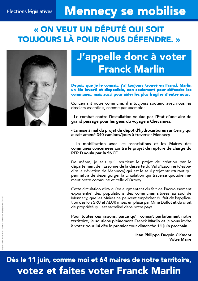 Distribué dans toutes les boîtes à lettres de la ville, l’appel du maire de Mennecy à voter pour Franck Marlin aux prochaines élections législatives les 11 et 18 juin 2017.