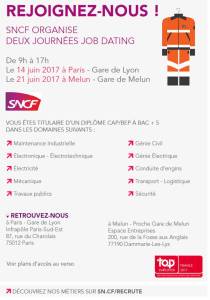 A la suite des opérations de recrutement déjà menées depuis le début de d’année, nous organisons deux Job Dating le 14 juin à Paris Gare de Lyon et le 21 juin à proximité de la gare de Melun, pour assurer les besoins très importants liés à la maintenance du réseau et des trains. Le public y sera accueilli par des responsables du recrutement SNCF accompagnés d’agents qui pourront expliquer leur métier.