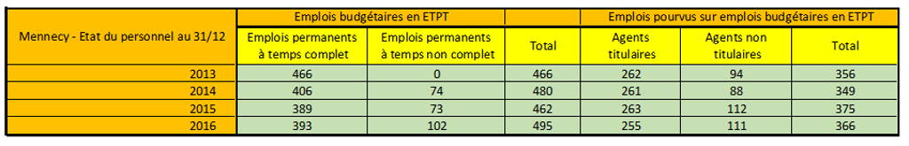 Le budget 2017 a été adopté avec 495 emplois budgétaires et 361 emplois pourvus. Nous avons perdu brutalement 5 agents pendant la nuit de la Saint Sylvestre entre 2016 et 2017. Il s’agit d’un titulaire et de 4 non titulaires.
