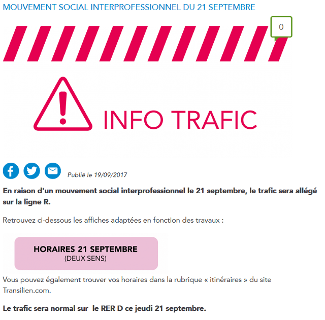 Vu ce soir, 19 septembre, sur le blog de la ligne D: journée normale le 21 septembre. Il faut comprendre que la journée suivra un cours habituel malgré un « mouvement interprofessionnel ».