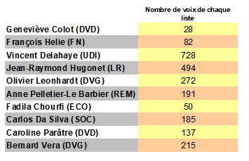 En Essonne, avec 5 sièges à pourvoir, c’est un scrutin de liste à la proportionnelle suivant la règle de la plus forte moyenne. Les 5 sortants sont: