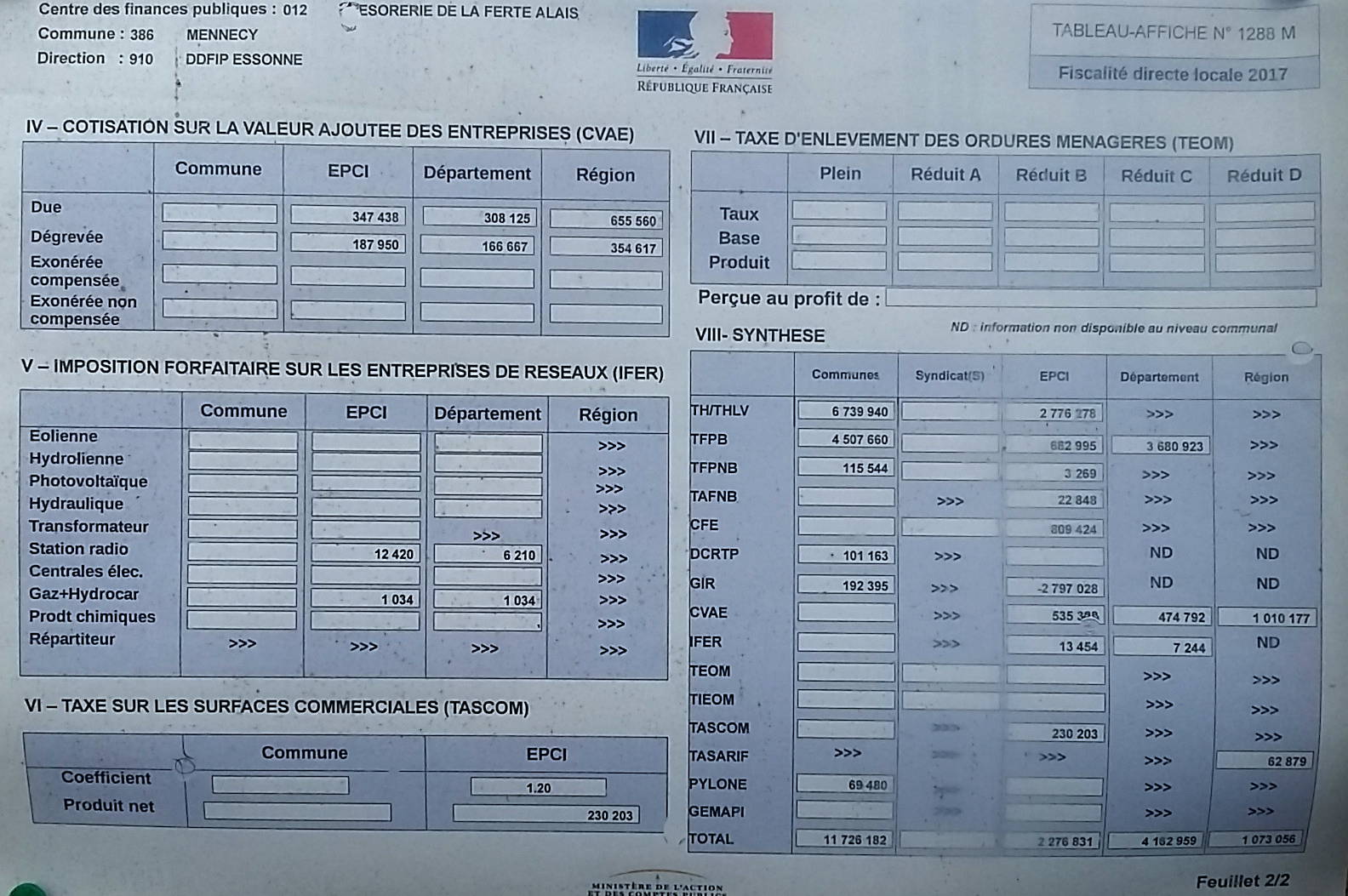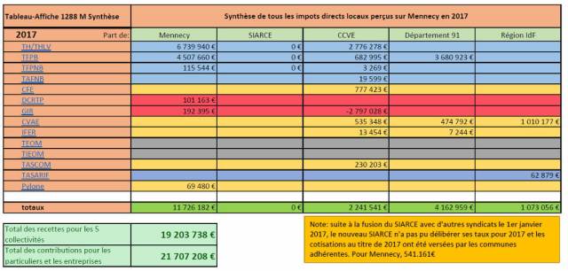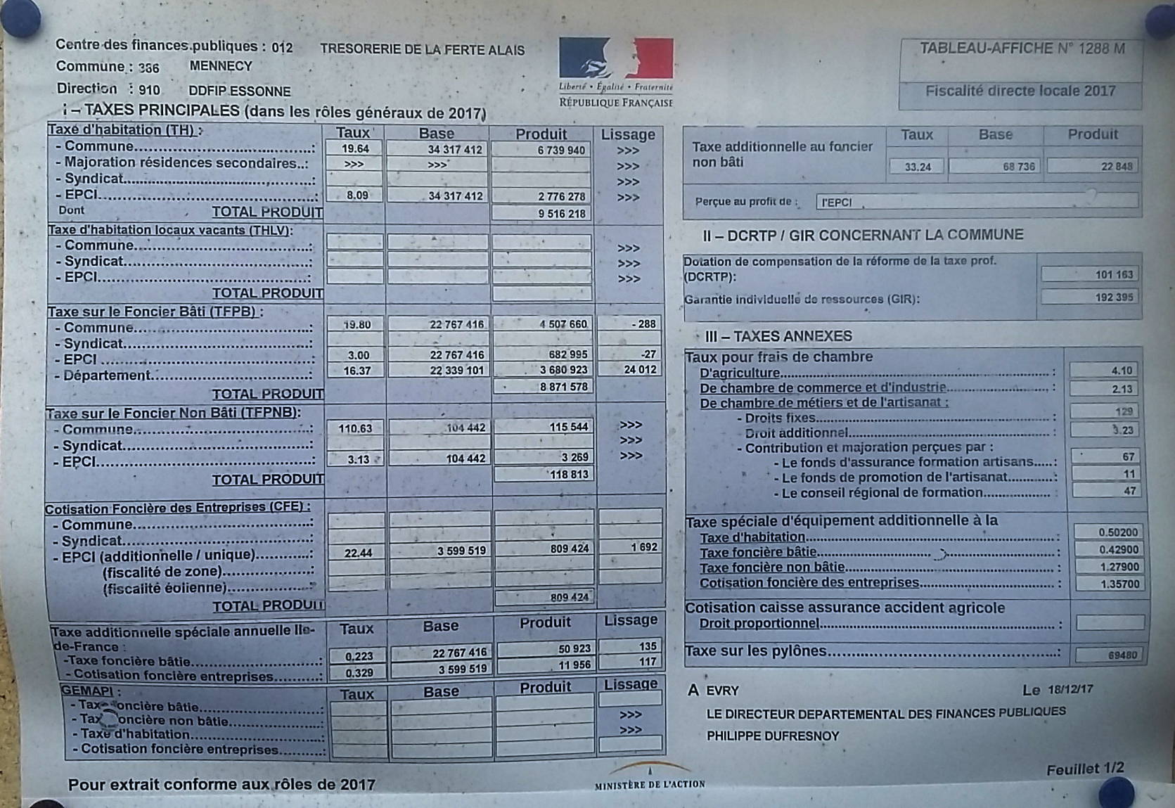 J’en avais déjà parlé le 19 janvier 2017. Il s’agit d’un affichage obligatoire dans toutes les communes de France: « le tableau affiche 1288 ». C’est un tableau qui rassemble tous les taux et tous les produits dans le périmètre de la commune pour tous les impôts directs locaux. On voit donc, sur un seul tableau et pour tous les particuliers et tous les professionnels de Mennecy, les impôts locaux collectés par: