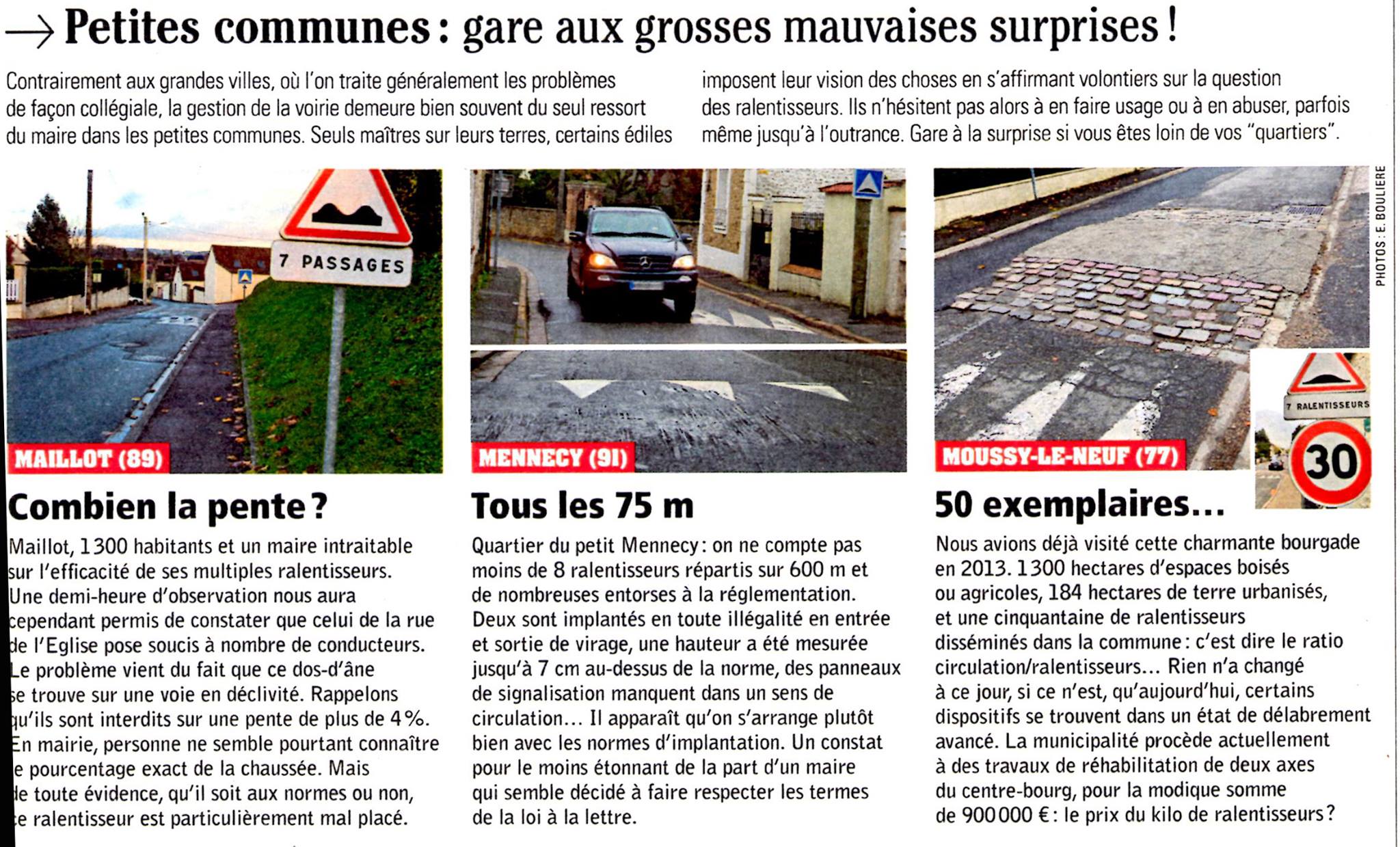 Le journal Auto Plus a publié le 15 janvier 2018 un article sur les ralentisseurs en général et a cité en exemple ceux de 3 communes en France, dont Mennecy et sa rue aux 8 ralentisseurs.