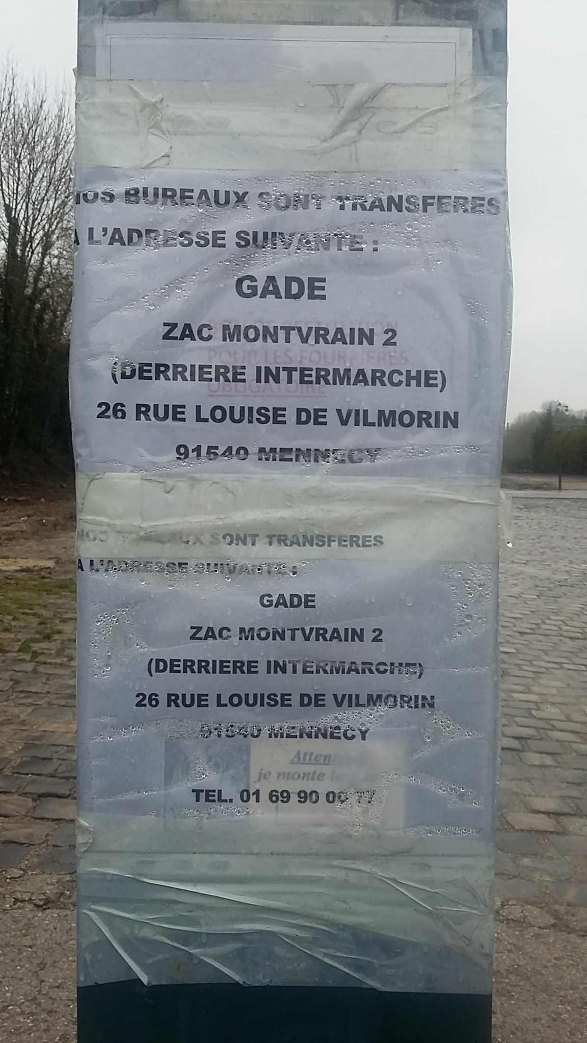 Gade, c’est l’entreprise de dépannage et remorquage autombile, elle récupère les véhicules accidentés, en particulier sur l’autoroute A6. Elle était installée sur l’ancienne gare de marchandises de Mennecy depuis des années et avait préparé son déménagement sur la ZAC Montvrain 2, derrière Intermarché. Le site est maintenant complètement libre, il n’y a plus de traces de l’ancienne activité de garage. Une affiche sur le portail indique où aller maintenant.