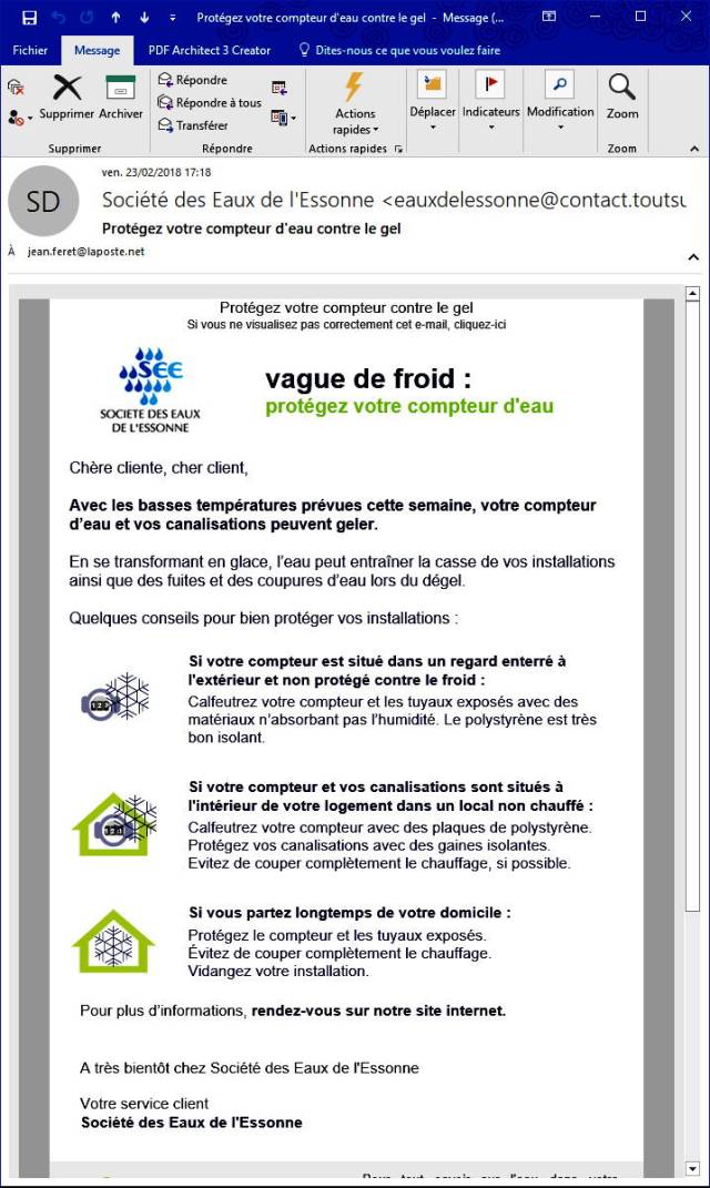 L’exploitant du réseau d’eau potable, à qui nous payons nos factures d’eau, a envoyé le message ci-dessous hier en fin d’après midi. Un petit coup de panique probablement, juste avant de partir en WE et en réalisant que la météo annonce du gel.