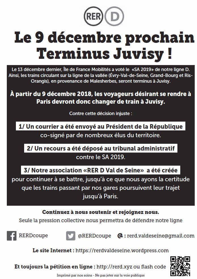 Tractage dans les gares du Val de Seine ce matin. Ils sont en effet embarqués dans la même galère que nous. Le SA2019 rend nos trains terminus Juvisy en passant par la vallée de la Seine. Nous partagerons les mêmes trains et les mêmes correspondances à partir du 9 décembre 2018 si nous ne combattons pas cette sinistre décision.