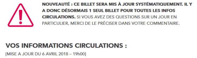 En lisant le blog de la ligne D, faites bien attention à la date et l’heure de la dernière mise à jour. Vendredi 6 avril à 19h00 dans l’exemple ci-dessous, copié à l’instant du blog de la ligne D.