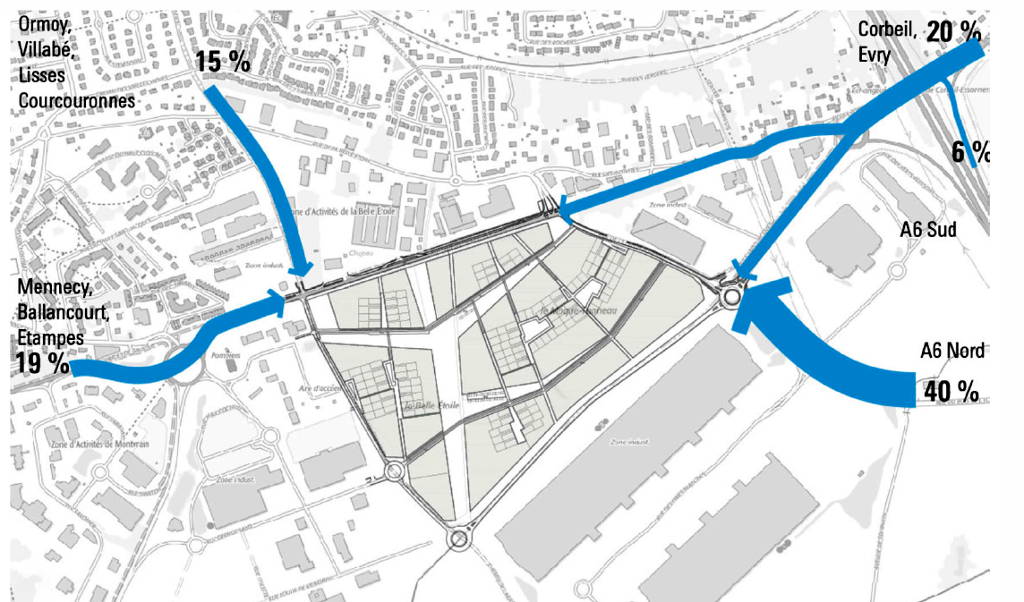 Mennecy est concernée par cette ZAC. Elle aura en effet 3 accès sur la commune de Mennecy: la rue Victor Grignard (la rue des pompiers), la rue Georges Sand (derrière Intermarché) et le Chemin Tournenfils (mitoyen avec Ormoy). L’étude de trafic routier évalue à 665 véhicules/jour en moyenne annuelle le total des échanges par ces 3 accès.