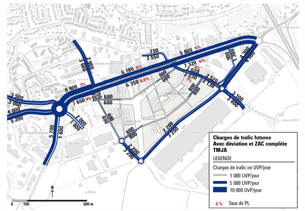 Au titre du trafic routier, on voit que cette ZAC générera 3500 entrées et sorties de véhicules par jour, en moyenne annuelle. C’est sans compter les mouvements de et vers la zone d’activités qui sera probablement une extension de la zone commerciale près de l’entrée de l’A6.