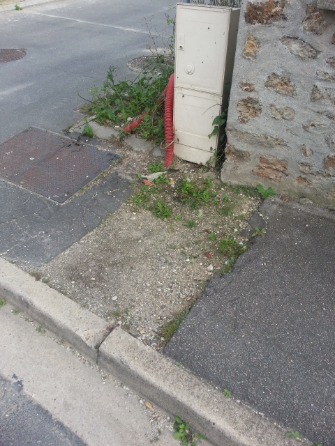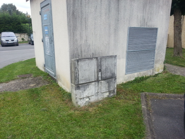 Autre armoire qui pourrait disparaître, au coin du chemin de la manufacture. Cette armoire est à l’extrémité de la zone desservie. A l’autre extrémité de la rue du Petit Mennecy, la chute de tension déstabilise le fonctionnement des lampes quand elles sont un peu usées.