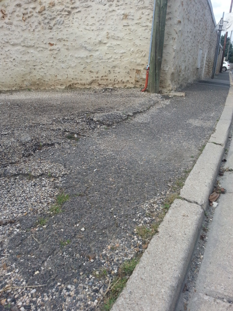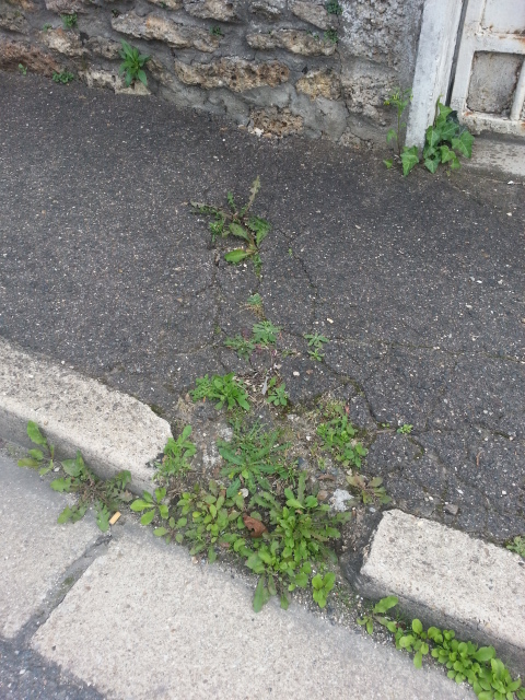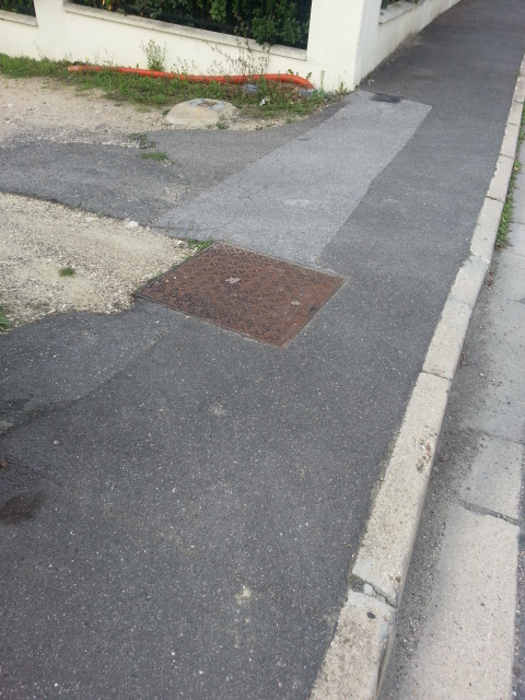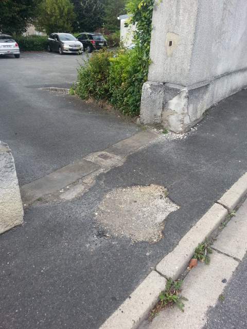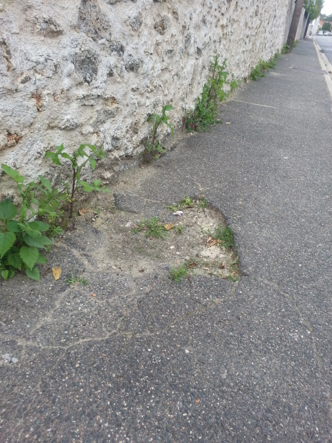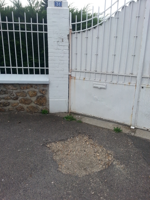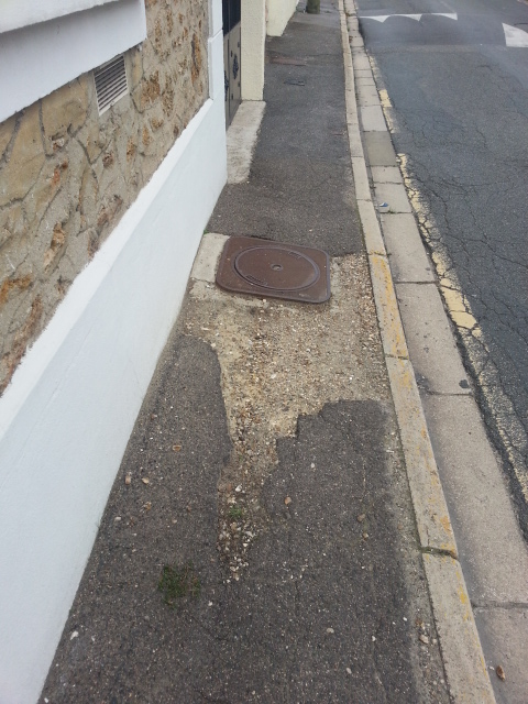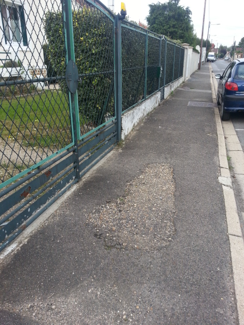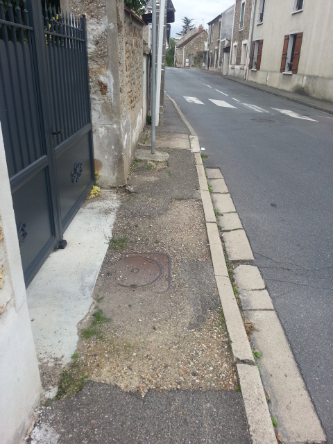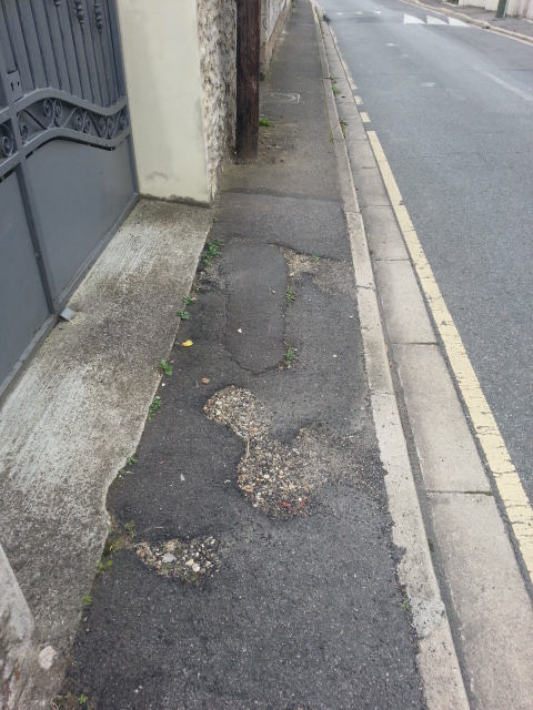 Maintenant, nous allons voir une enfilade de trous, au moins ceux qui sont photogéniques et qui, sans exception, rendent la marche sur les trottoirs de la rue du Petit Mennecy si difficile que les piétons empruntent la chaussée systématiquement, même quand ils sont valides.